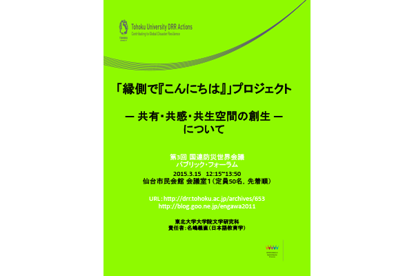 「縁側で『こんにちは』」プロジェクトはそんなコミュニケーションを誘発する空間を作る取り組みです。今日は,このプロジェクトが何を目指し何を行ってきたのか,行政とどのような連携を行ってきたのかについて,取り組み責任者や名取市社会福祉協議会,学生ボランティアが話をします。それを通して,一般市民が「防災・減災・復興のまちづくり」に関わっていく一つの方法を提示したいと思います。