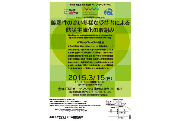 東日本大震災被災地におけるコミュニティ崩壊危機は、一方で少子高齢化が進む地方自治体が抱える最重要課題でもあります。多様性を認めジェンダー視点に立つみやぎジョネットの被災地支援は「脆弱性の高い受益者」がエンパワメントされて支援側に廻り小規模コミュニティの維持、地域包括ケア機能の構築に寄与するものです。防災主流化を切口に市民自らの手による地域包括ケアを狙う松阪市との恊働の取組について、事例を紹介し会場の皆さんからご意見をいただき議論を深めます。