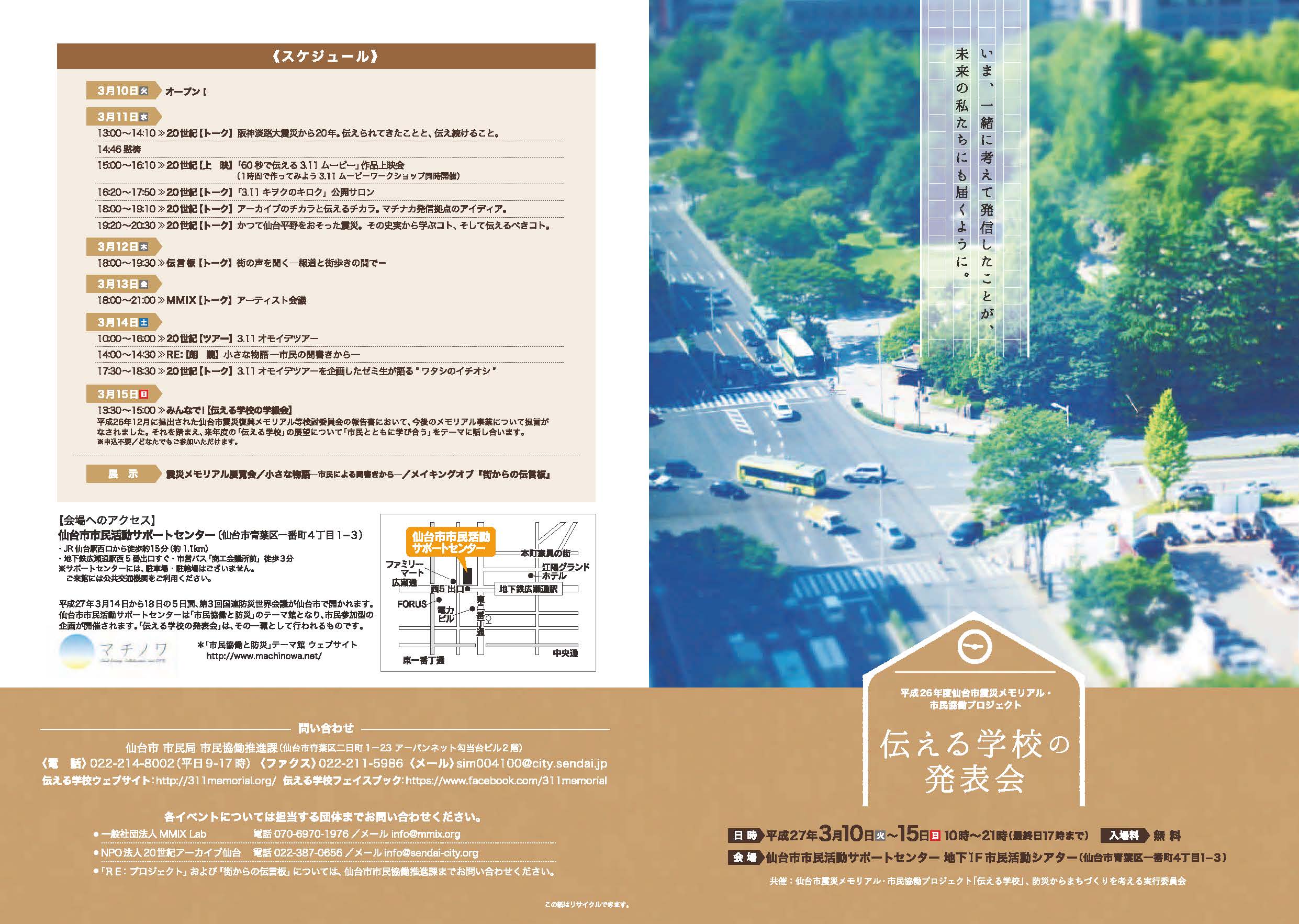 仙台市震災メモリアル・市民協働プロジェクト「伝える学校」は、市民の皆さんひとりひとりが伝える視点をもって発信していくことを目的として、市民団体との協働により進めているプログラムです。今年度は、協働団体がそれぞれの得意分野を活かしたゼミを展開したり、市民参加型プログラム「街からの伝言板」を新しく始めるなど、市民の皆さんとともに「未来に伝えたいことを残す」ことに取り組んだ1年でした。今回の発表会では、各取り組みの成果を、さまざまな形でご報告します。