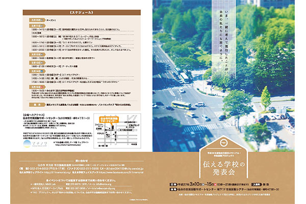 仙台市震災メモリアル・市民協働プロジェクト「伝える学校」は、市民の皆さんひとりひとりが伝える視点をもって発信していくことを目的として、市民団体との協働により進めているプログラムです。